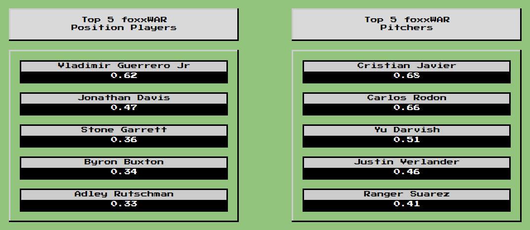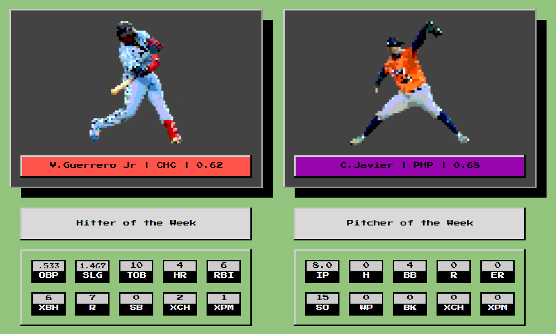 Vlady Daddy has himself a week, though I think it was mostly just 1 game that really put him on the top of this list, where he hit 3 home runs and a double. Cristian Javier takes the top spot for pitchers, which is unfortunate since he wasn't even good enough to finish out the no-no. Do better next time.