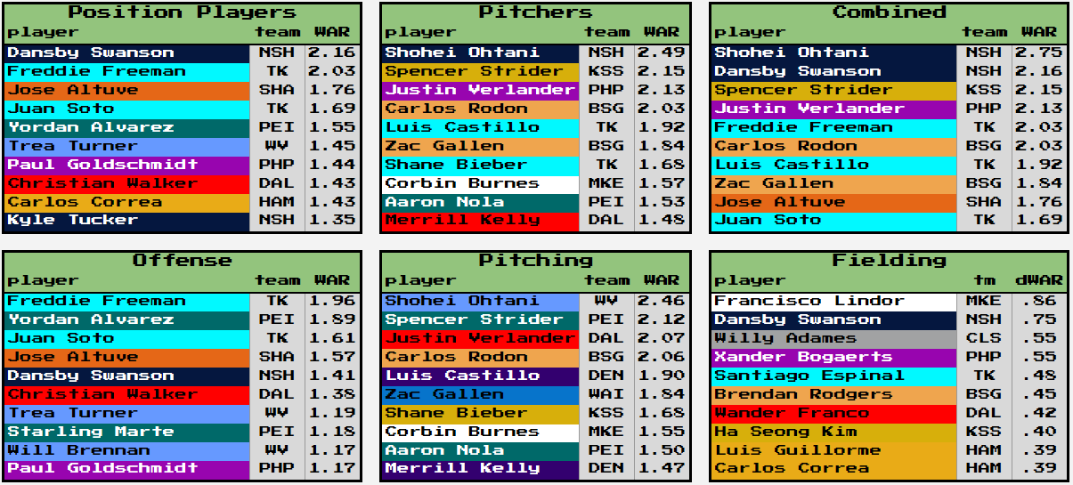 Dansby continues to hold onto the top position player spot, carried by his glove and a solid - but not great - offensive performance. Shohei Ohtani is still number 1 overall, almost entirely carried by his arm.