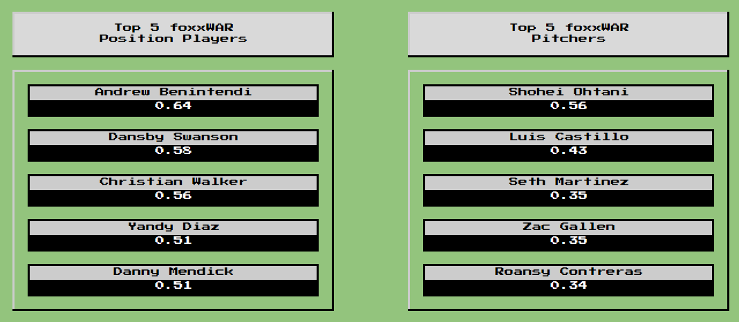 foxxWAR Week 10 Update Foxx Dashington Oct 9, 2023 • 1 min read I'm feeling lazy, so here is the update with no commentary.Top of the weekHonorable mentions of the weekGood playersBad players