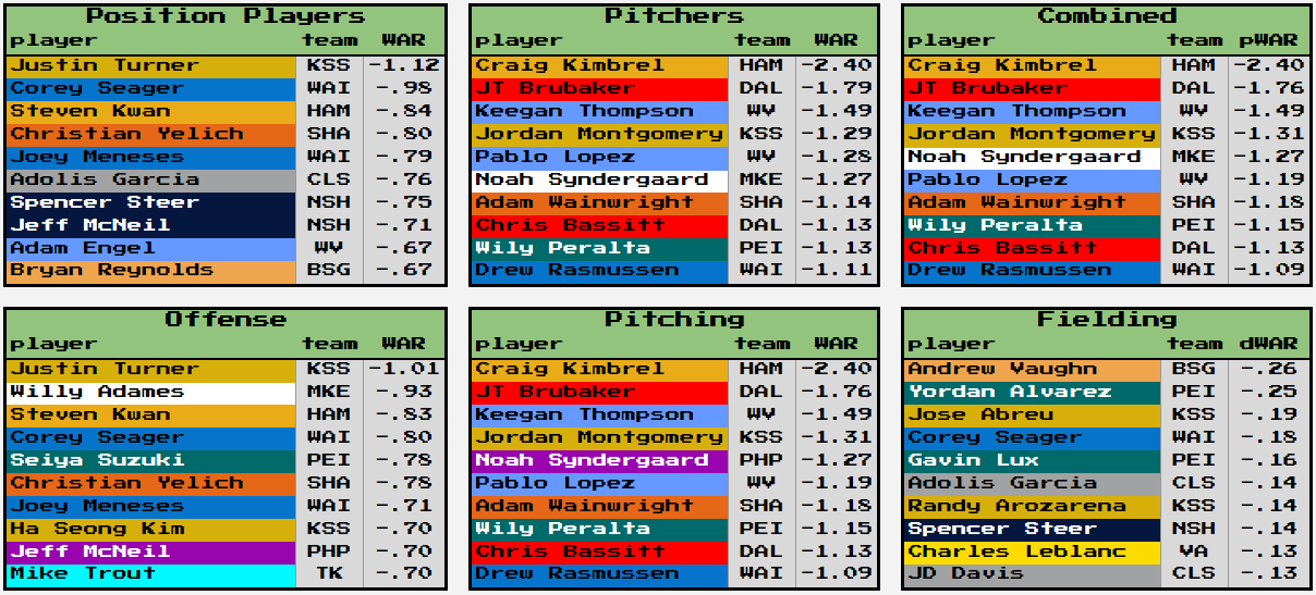 Enjoy some players who have been bad. Kimbrel is the first player to break the -2 WAR threshold. Truly a historic achievement for the veteran.