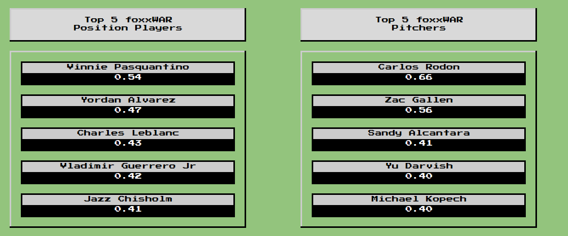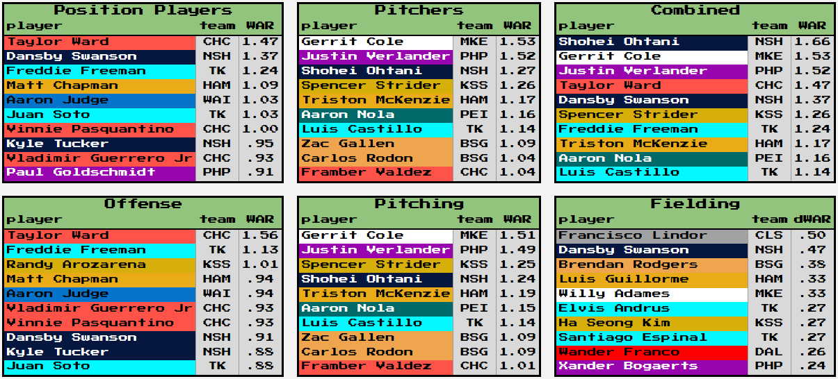Total WAR is including Week 7 games played up to this point, but so far Taylor Ward continues to reign supreme for all position players while we finally have a new leader on the pitcher side. Triston McKenzie loses his top spot to Gerrit Cole and others. Francisco Lindor passes Swanson as the top defender, as well.