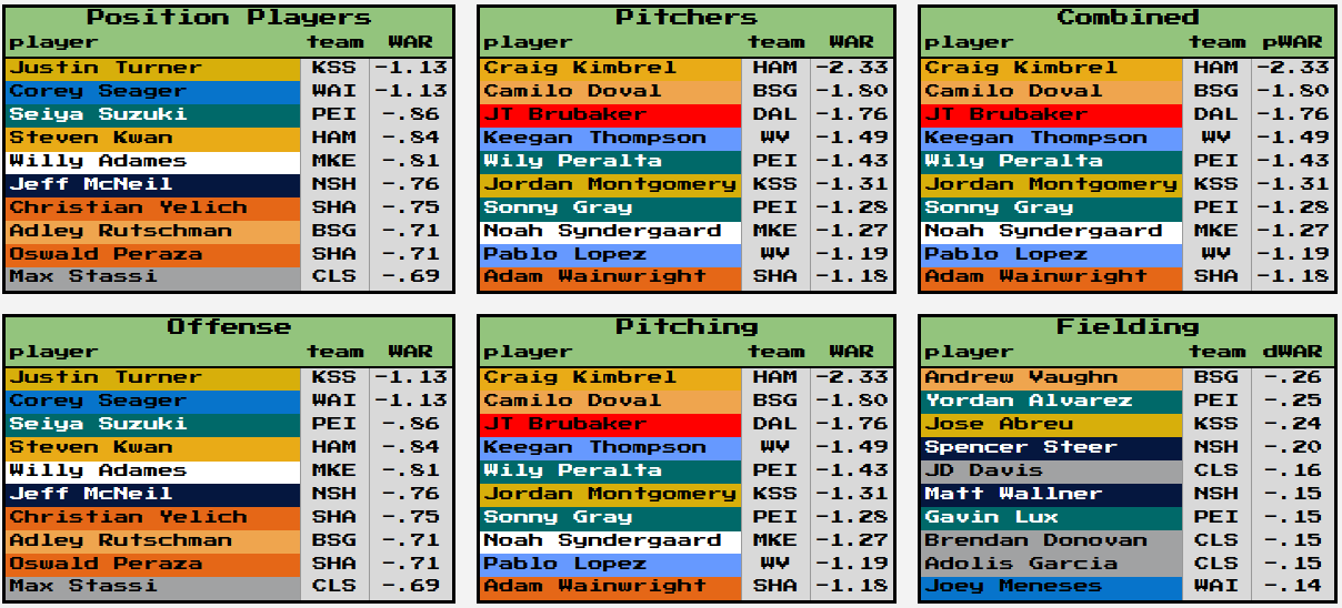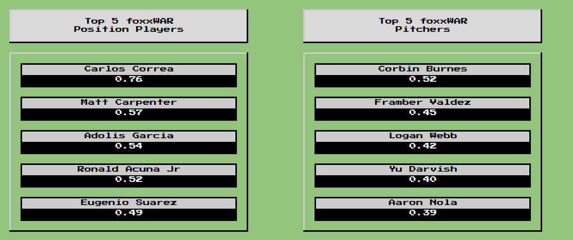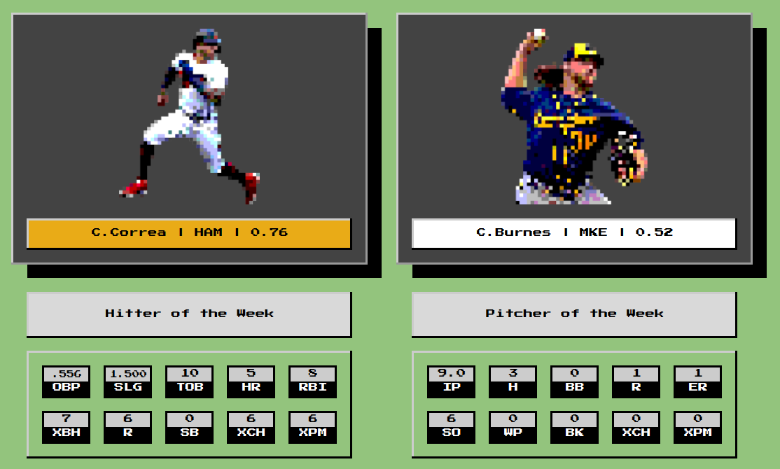 Players of the week are Carlos Correa with a disgusting .76 WAR. Incredible week at the plate, and 6 for 6 on x-checks! That ankle seems fine to me. Corbin Burnes pulls in the last minute Pitcher of the Week honors, narrowly knocking Framber Valdez off the top spot. Only 6 Ks in Corbin's outing, but throwing 9 innings will usually do the trick.
