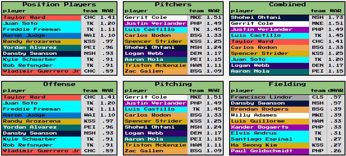 For the overall totals, Taylor Ward continues to hold onto the top spot for position players. What's this? The Kaiju are hoarding top 10 spots. Rude, honestly. Meanwhile, yellow/oranges teams control a big portion of the pitcher top 10 list. Triston McKenzie has fallen from his top spot all the way to 9 after just 2 weeks.
