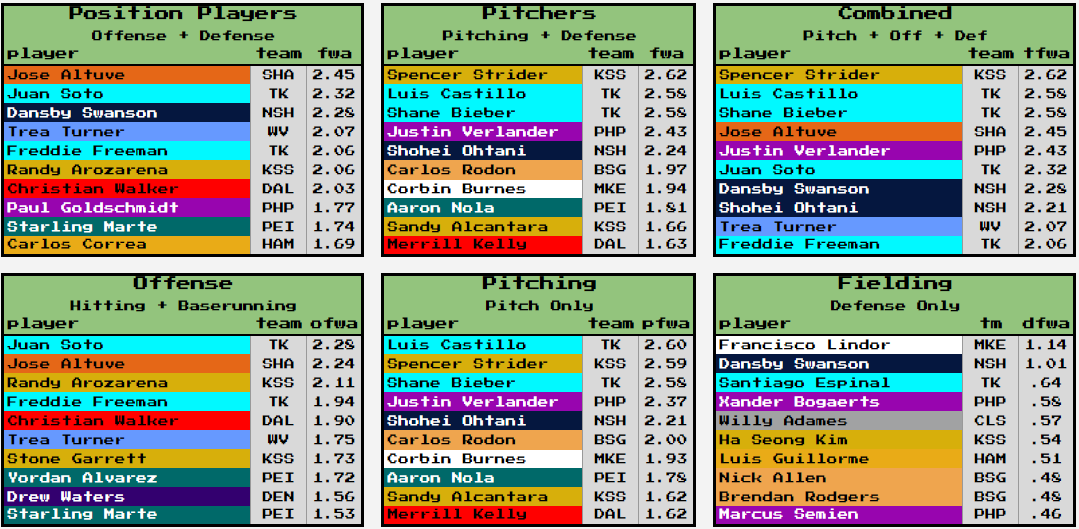 Spencer "I-have-a-mustache-look-at-me" Strider continues to be really good on the pitcher side and he is now the #1 overall player, as well. Fun note: Ohtani is now officially a negative FWA hitter. The Ohtani Curse is still half alive.