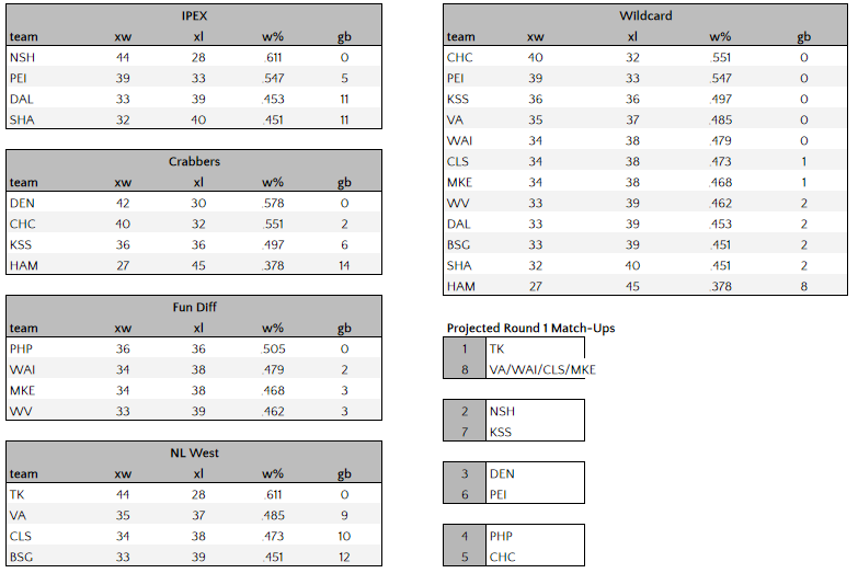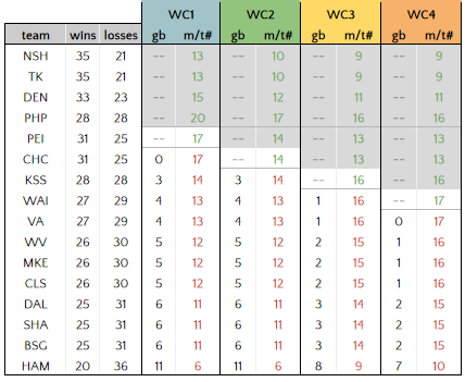 - The final playoff spot is more or less a 4 way tie now. VA has the advantage with a fractional lead over WAI, CLS, and MKE.