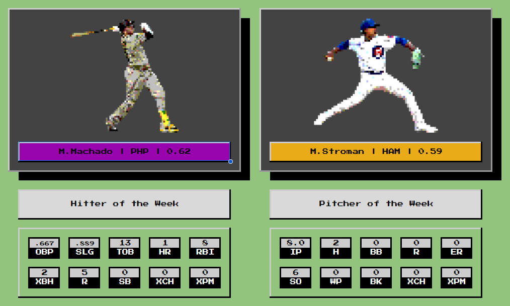 Manny Machado had a nice week by getting on base a ridiculous 13 times. Not a lot of production in terms of xbh, but the sheer number of times of base earns Manny the weekly award.
