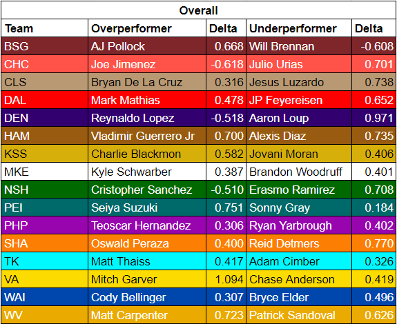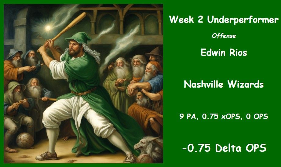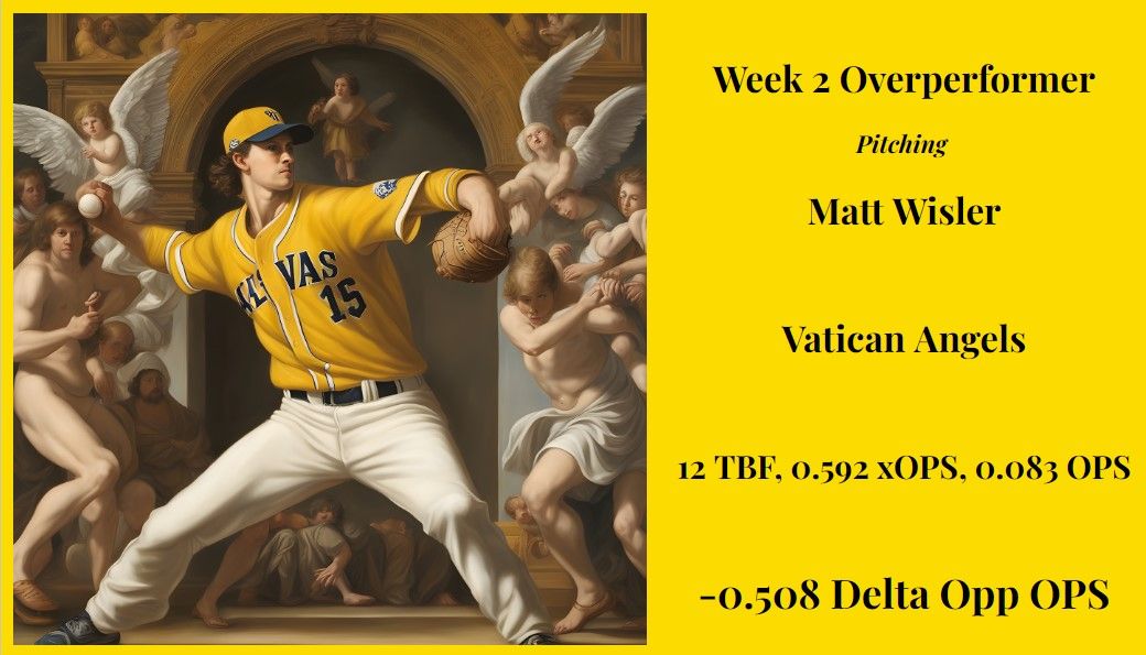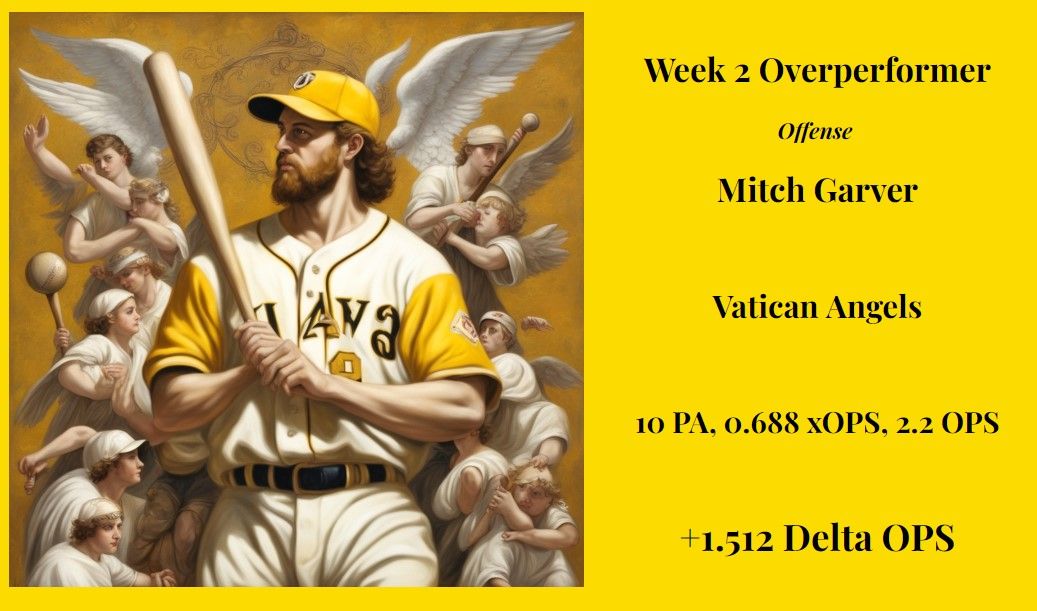 One more fun fact. In Week 1, Meneses ran away with the Overperforming Hitter award, but he was still one of three hitters with a delta OPS > 1. This week, Mitch Garver won with a 1.541 dOPS. His nearest competitor, Shohei Ohtani, had 0.855. Mitch nearly lapped the field.